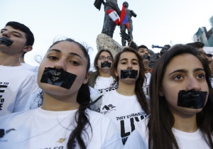Com suas bocas fechadas, jovens participam de manifestação na Praça dos Mártires, em Beirute, Líbano, organizado pelo principal partido armênio do Líbano, o Tashnag, em virtude do 100º aniversário do massacre de armênios sob o Império Otomano em 1915.